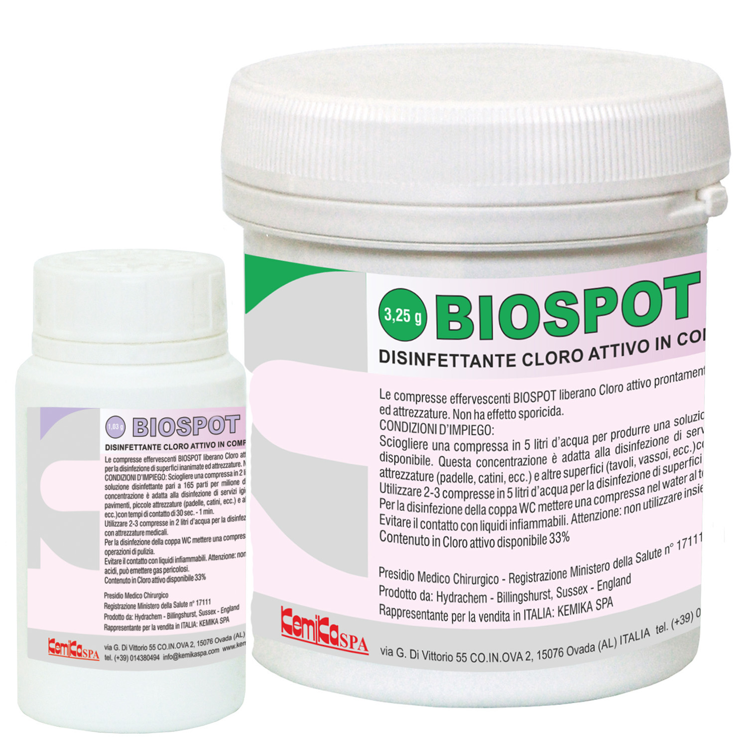 BIOSPOT is a sodium dichloroisocyanurate based disinfectant in tablets containing 33% of active chlorine. When dissolved in water, BIOSPOT releases hypochlorous acid for a quick disinfection. The hypochlorous acid released by BIOSPOT is present in water solution at a 6.0-6.5 pH that makes the disinfecting action faster if compared with the similar effect of normal bleach (sodium hypochlorite). BIOSPOT can be used in combination with a few detergents of the KEMIKA line to make an effective chlorine based disinfectant detergent. The product is registered at the Italian Ministery of Health N. 17111