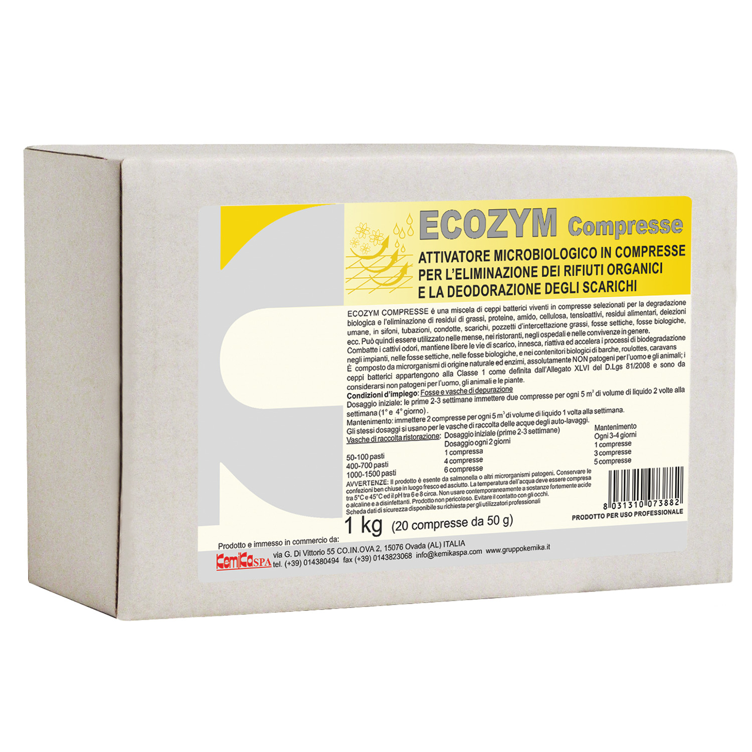 The tablet of ECOZYM COMPRESSE is a blend of leaving bacterias capable to degredate organic waste namely greases, proteins, starches, surfactants, human excrements, etc. It cleans and deodorize sewer lines, food traps, septic tanks, etc. It is used in hotels, boats, food industry, colleges, factories.