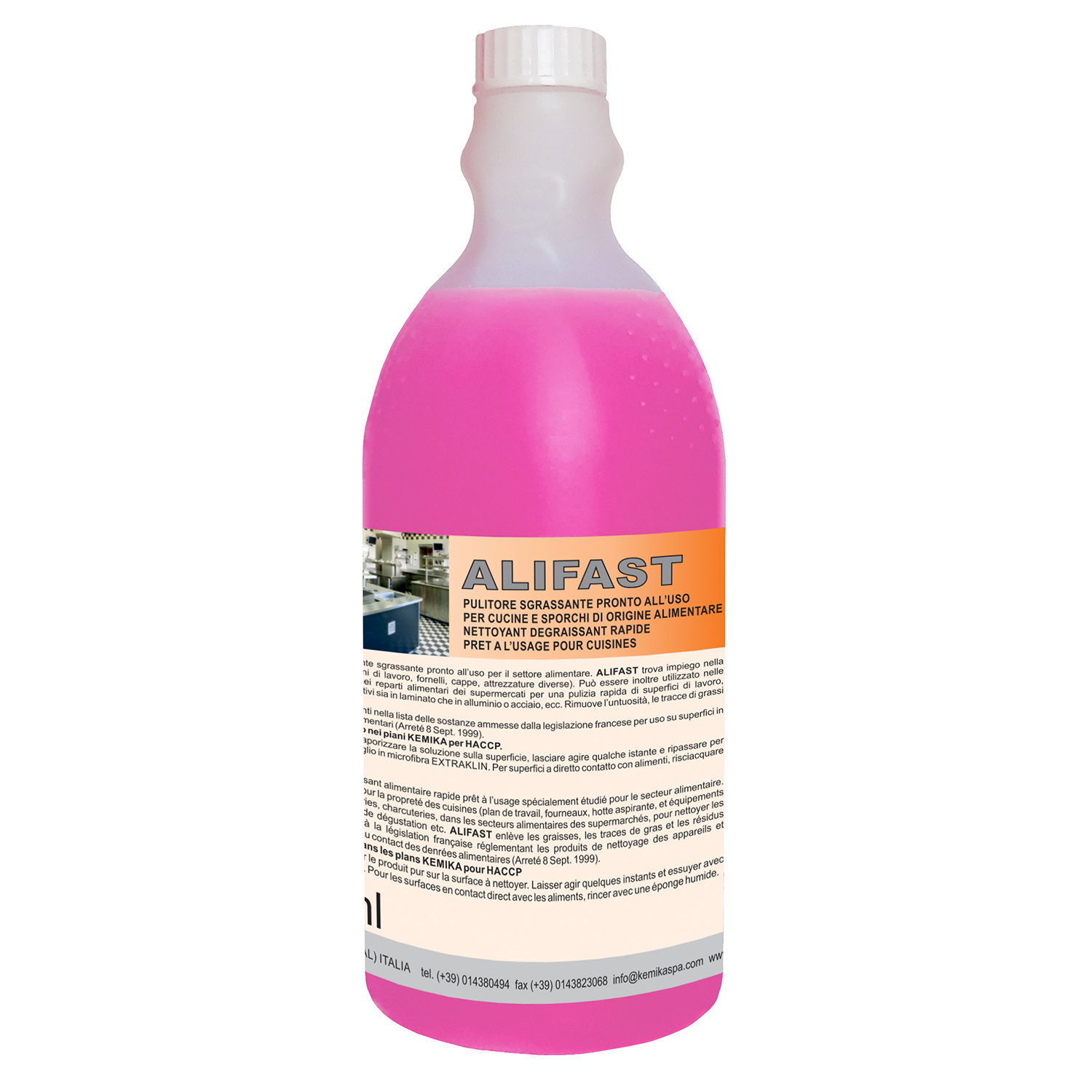 Detergente sgrassante, pronto all'uso, specifico per il settore di produzione alimentare e per la ristorazione collettiva. Disponibile in formulato con sali quaternari (ALIFAST D) per un effetto disinfettante delle superfici.